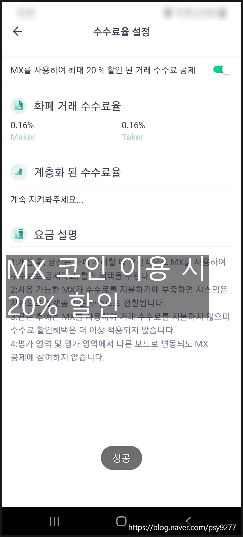 수수료율 설정 항목을 보니 MX 코인으로 결제하게 되면 20% 할인이 되는 것을 알 수 있습니다.